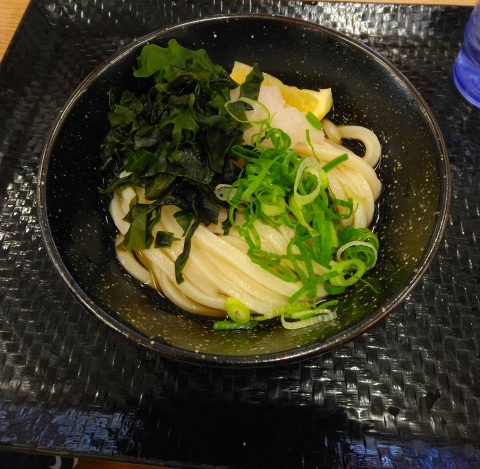 もっちり感の中にしっかりコシのある麺。それが、甘口で丸みのあるダシとのコンビネーションがよい。非常に値段安いのに、さらにネギや天かすの他、わかめまでも無料。非常に満足