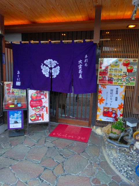 出雲大社の鳥居の前にある蕎麦屋。他にも出雲そばを食べさせてくれる店は並んでいるが、この「出雲蕎麦 おくに」が朝早く8時~の開店であるので、観光バスの団体客が入っている前に店内に入ることができる。とはいえ、店内に入るには、並ばないといけないが。。。
