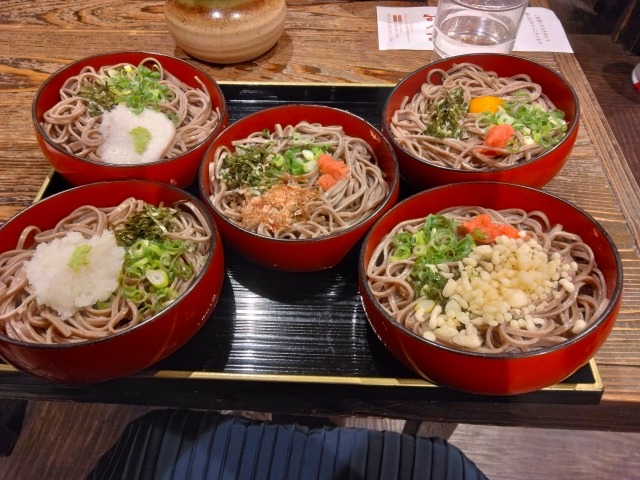 せっかくなので、5種を食べることができる五種割子そばを。皿は5枚あるが、ひとつひとつは小さいため、女性でも食べることができる量。観光客相手の蕎麦ではなく、しっかりと毎朝手打ちしている本格的なもの。非常に蕎麦としておいしい。