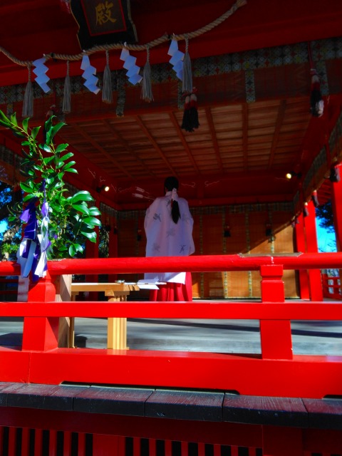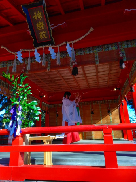 正月三が日、破魔矢を一対お受けになられた方は、その破魔矢を手に神楽殿で巫女が御神楽を舞い、鈴にてお清めをしてくださる。